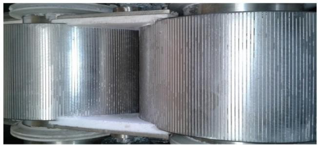 粉狀物料定量、均(jun)勻(yun)地(di)加(jia)入(ru)軋(zha)片(pian)主(zhu)料(liao)鬥(dou),使(shi)軋(zha)片(pian)主(zhu)料(liao)鬥(dou)內(nei)保(bao)持(chi)恒(heng)定(ding)的(de)料(liao)位(wei),然(ran)後(hou)由(you)軋(zha)片(pian)主(zhu)料(liao)鬥(dou)內(nei)的(de)縱(zong)向(xiang)錐(zhui)螺(luo)旋(xuan)對(dui)粉(fen)料(liao)進(jin)行(xing)預(yu)壓(ya)縮(suo)並(bing)輸(shu)送(song)至(zhi)兩(liang)隻(zhi)壓(ya)輥(gun)的(de)弧(hu)形(xing)槽(cao)口(kou)的(de)物(wu)料(liao)咬(yao)入(ru)槽(cao)內(nei)並(bing)瞬(shun)間(jian)強(qiang)製(zhi)壓(ya) 縮,物料經壓縮成形後承受的壓力逐漸減小,在其彈力及重力作用下,從槽內脫落,進入破碎整粒 係統,然後根據用戶的粒度要求過篩、分級,得到符合質量要求的均勻顆粒狀產品。篩下粉重新返   回料鬥循環利用。(在壓塊時,粒狀物料在兩個反向旋轉的輥子之間被壓實,壓塊可使用粘結劑。)